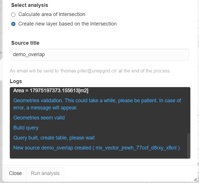 Create new layer based on the intersection: Before clicking on Run analysis, you must define the name of the data source that will be published in the current project. Once the analysis completed, you will receive an email informing you that the source is available in the database and you will be able to use it to create new views in the projet.