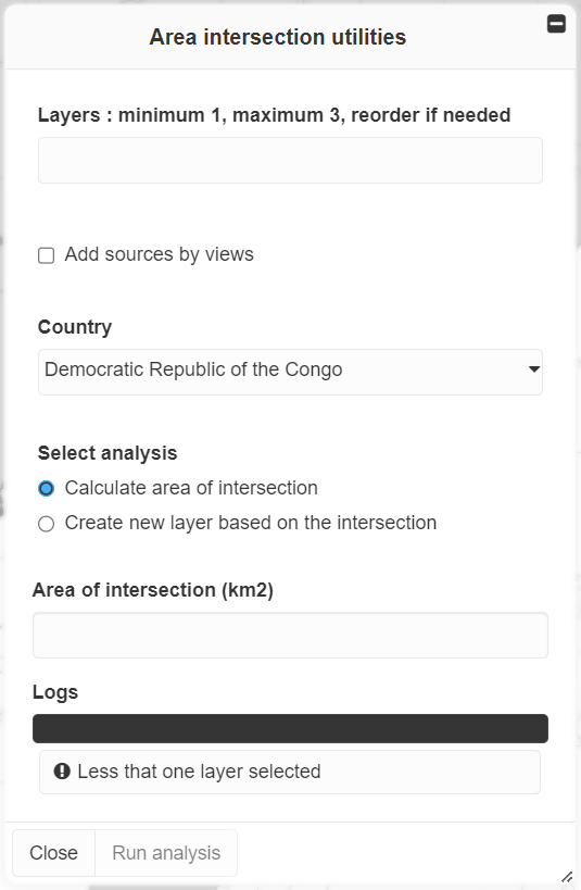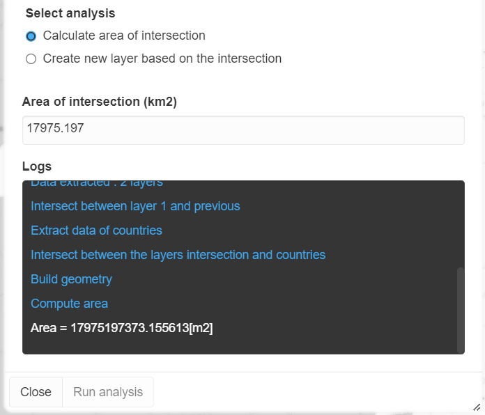 Calculate area of intersection: click on Run analysis once the sources have been selected. The overlap area in km2 is displayed in the MapX interface.