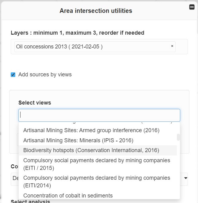 The Area intersection tools are only available to publishers due to the high resource-load needed to process the data in the back-end. For the same reason, the number of layers that can be used for analysis is limited to 3, plus the administrative boundary of a country.