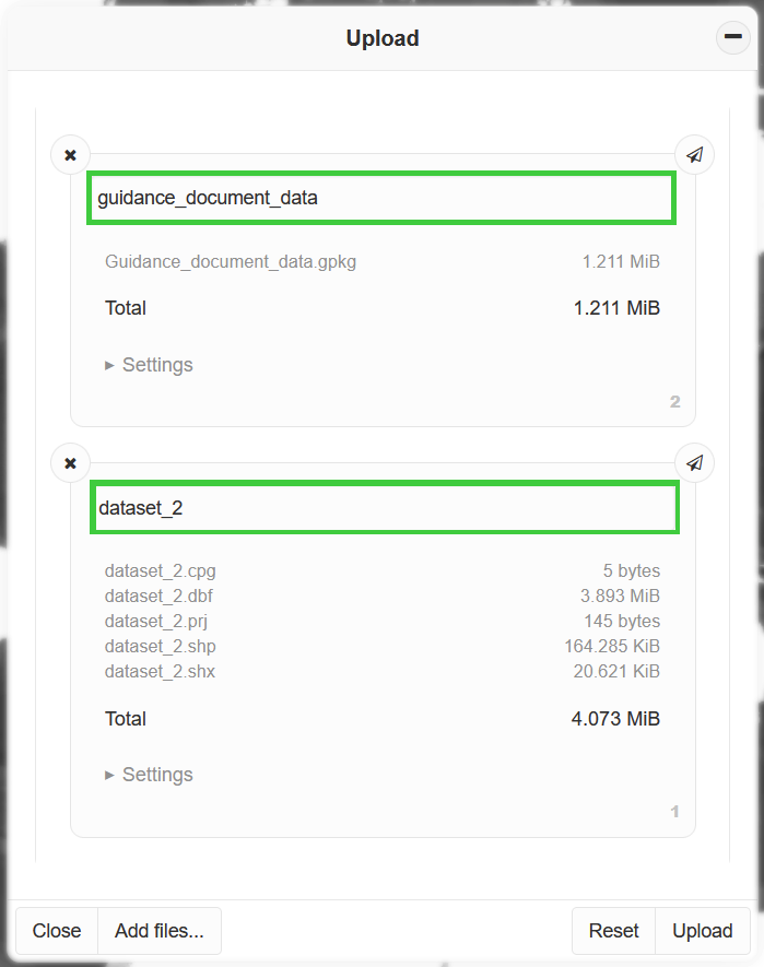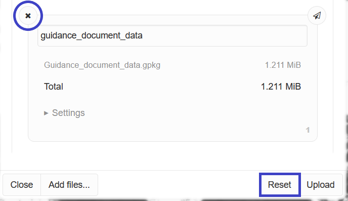 If needed, you can remove a dataset from the Upload tool by clicking on the X button located in its upper left corner. Moreover, it is possible to empty the entire Upload tool by clicking on the Reset button.