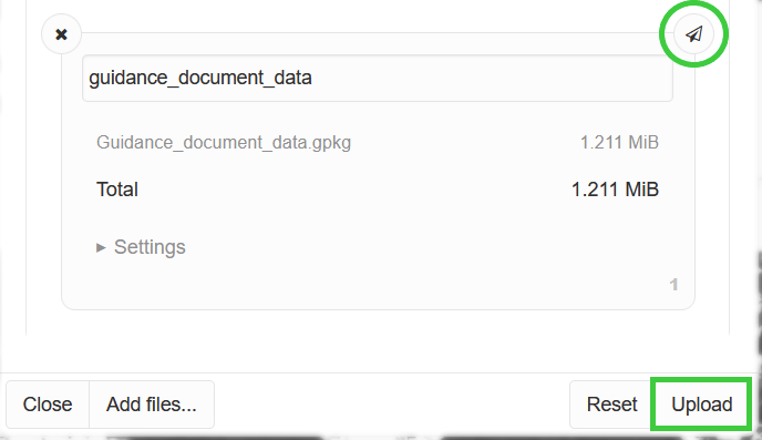 Once configured, datasets can be imported into MapX one by one by clicking on the Send button located in their upper right corner or in bulk mode by clicking on the Upload button.
