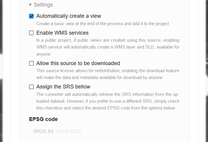 Assign the SRS: The upload tool will automatically retrieve the Spatial Reference System (SRS) of the dataset and will reproject it to WGS 84 (EPSG:4326), the SRS used to store all data in the MapX database. If you want to bypass this behavior, you can enable this option and manually select the SRS corresponding to your dataset.