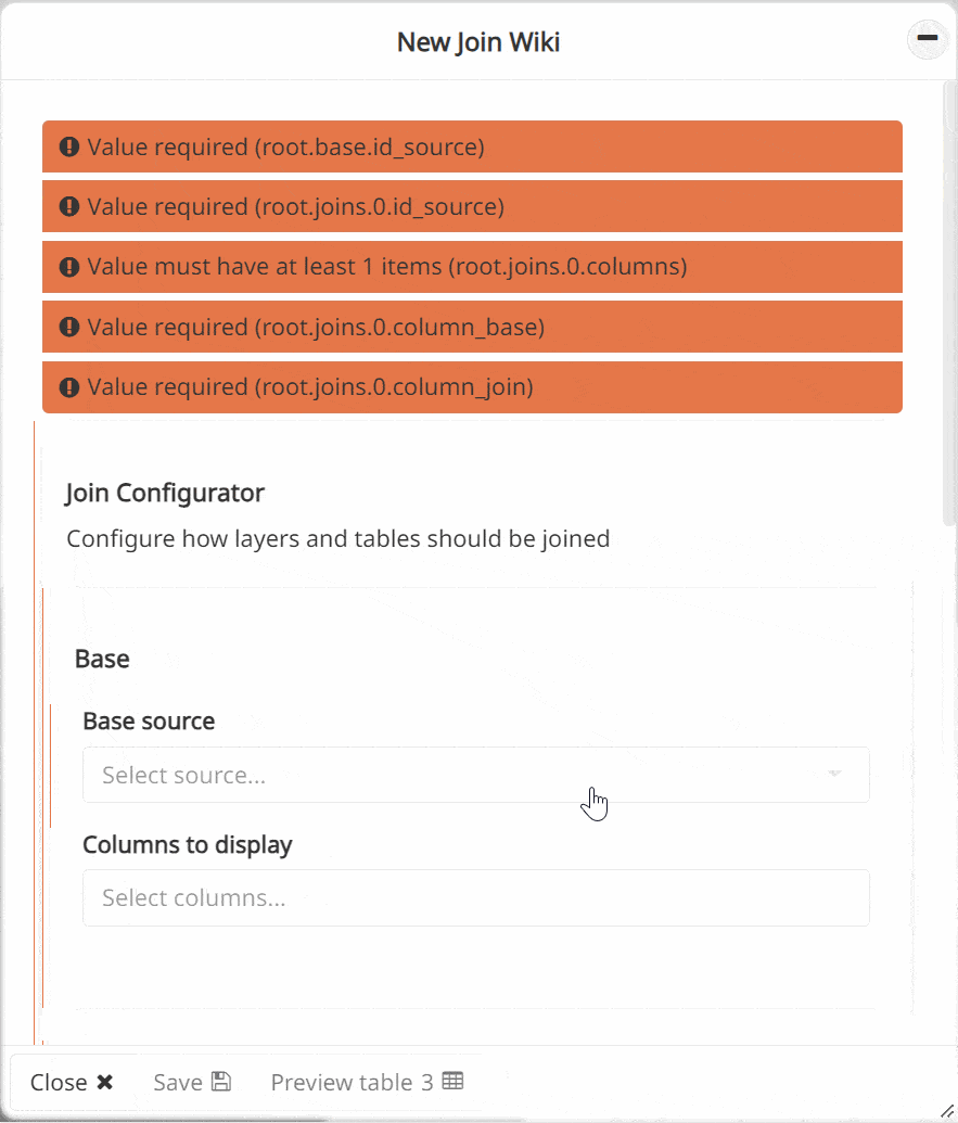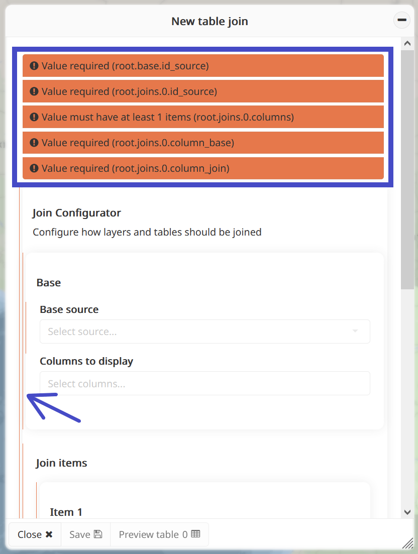Join item(s): Tabular or vector sources whose attributes are joined to the base source. Multiple join items can be joined to the base source. Please note that the geometry column of the join items is not included in the process. Only one geometry column will be available in the join-type source, which comes from the base source.
