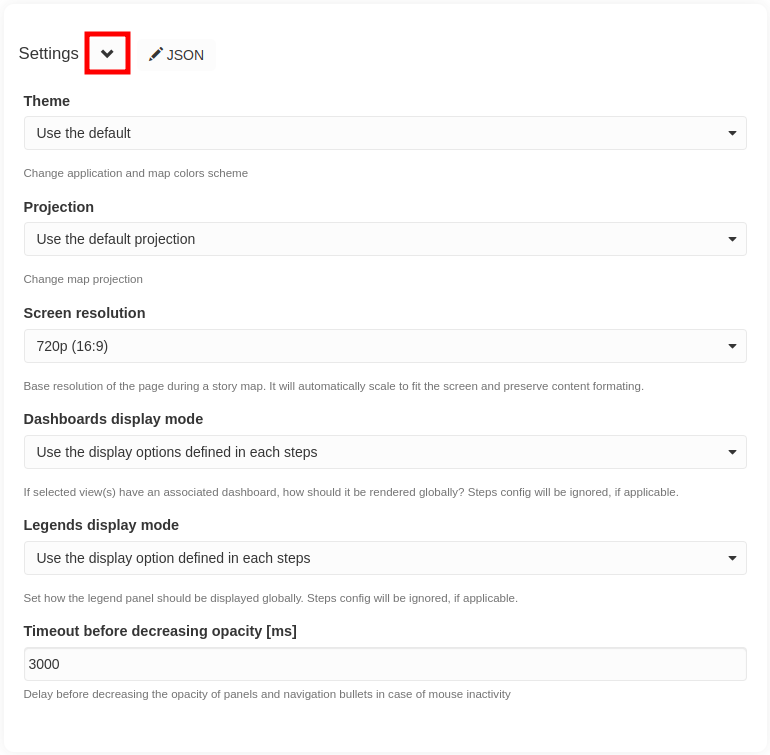 Dashboards display mode: if view(s) in the story map have an associated dashboard, this setting allows to define how they will be rendered (i.e., open, closed or hidden). This setting applies to the whole story map, but it can be overwritten at each step if necessary.