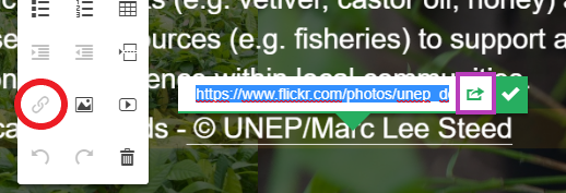 You may need to add a hyperlink in your narrative to refer to further information or to cite a data source. To do so, select the text to attach the hyperlink to, and click on the “tie” icon. A text box appears above the highlighted text, paste your link, and click on the green (check) button to save it. If you want the link to open in a new tab (which we recommend), you just have to click on the “external” (circled in purple) button before saving your link.