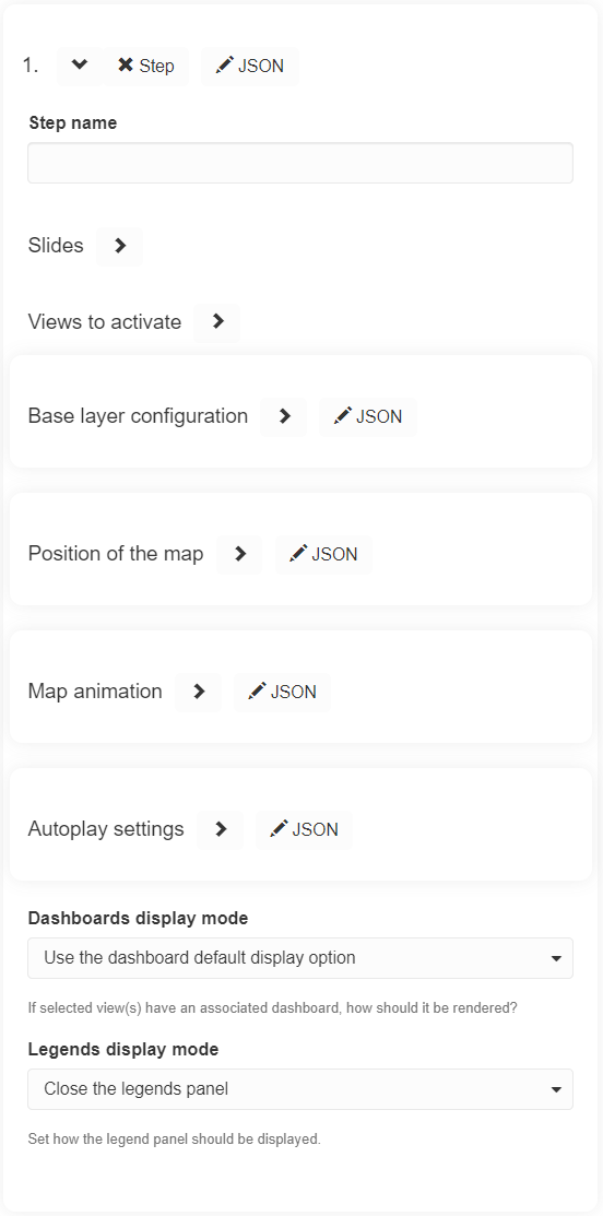 Dashboards display mode and Legends display mode: override the global options set in the story map settings.