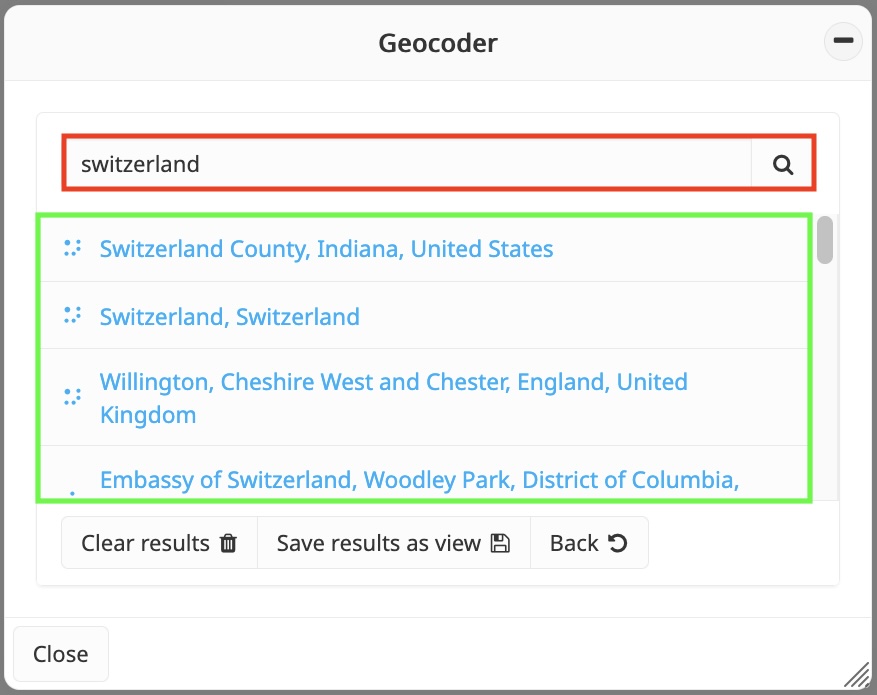 The Geocoder enables users to convert location text (e.g., country, region, postal address) into geographic coordinates and access it in the map. The search results are stored in a temporary layer, allowing users to download them as a GeoJSON file or add them to the current project if their privileges allow it (i.e., publisher, admin).