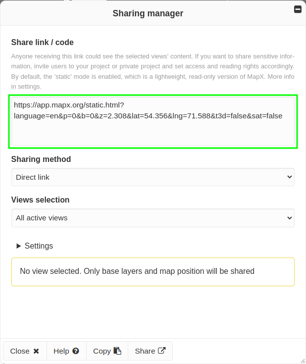 Anyone receiving a link generated by the Sharing manager will be able to access its content. If you want to share sensitive information, it is recommended to rather invite users to your project and set access and reading rights accordingly.