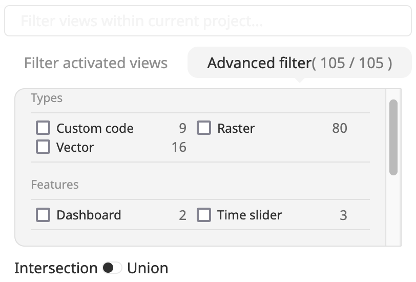 Users can filter views that are available on the list through keyword(s). The process can be performed by typing manually the keyword(s) in the text field below the name of the project. The keywords are searched in title and abstract of all available views for the selected project and on the metadata of the source layers from which the views were generated. Views can also be filtered by types, features and/or rights from the Advanced filter module. Multiple selection is allowed and can be managed in two different ways depending on the user’s choice at the bottom of the module: 1) “Intersection” (default) or 2) “Union”. The first option displays views that satisfy all parameters while the second results in a larger list of views, where displayed views are those that satisfy at least one parameter. Finally, views can be filtered according to their status (active on map or not).