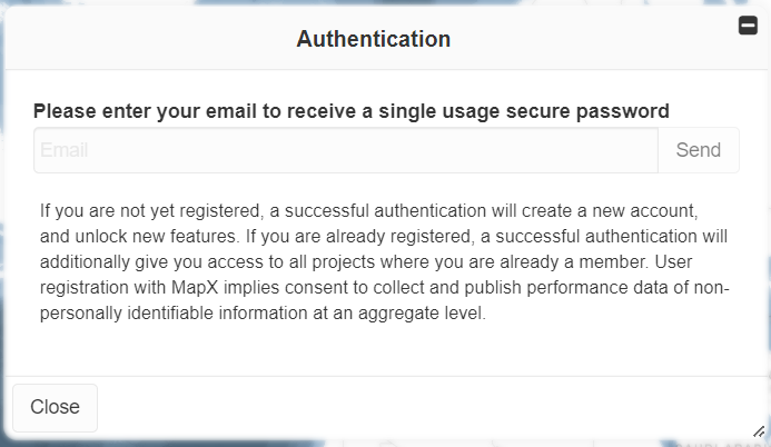 No password to remember! To login in MapX, users only have to provide their email address to receive a single use password valid for 20 minutes. If after a few seconds no email from bot@mapx.org is visible in your inbox, don’t forget to check your SPAM folder. By logging in MapX, users have access to additional functionalities and datasets/content according to their privileges in the different projects.