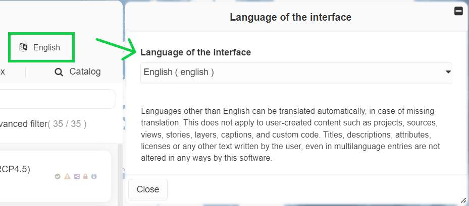 The MapX user interface is currently available in all the UN’s six official languages (Arabic, Chinese, English, French, Russian, Spanish) and in German, Bengali, Dari/Persian and Pashto. It can be changed simply by clicking on the dedicated button. Note that only the interface is translated into these languages. The data itself remains in the language provided by the publishers.