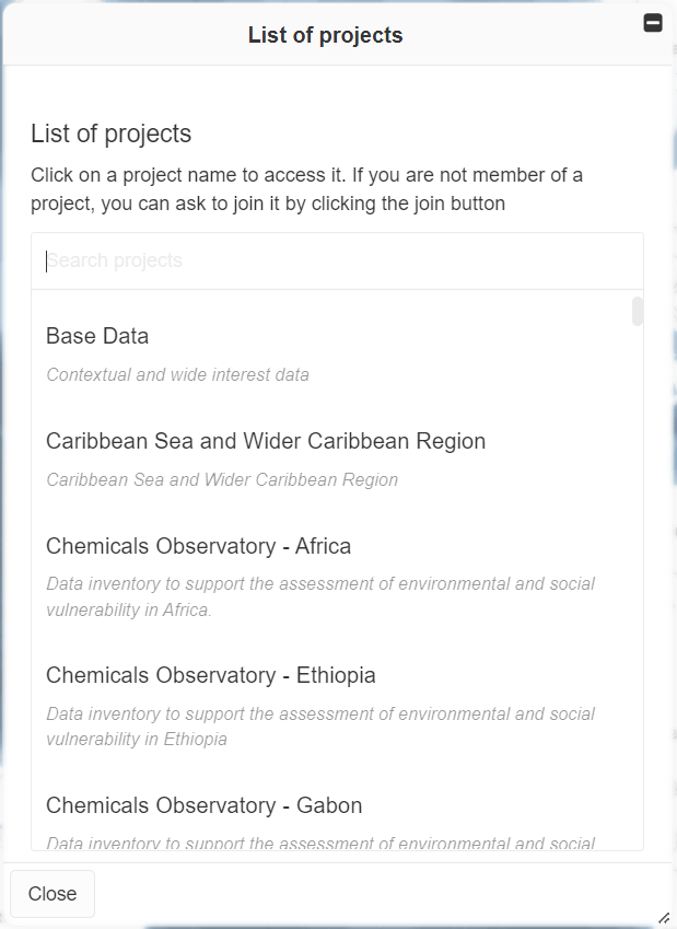 By default, the “HOME” project is loaded (as in the figure above). If a user previously visited MapX within the last 30 days, the last project they consulted will be loaded. Users can change project and explore MapX content by clicking on the dedicated button (name of the current project). A panel listing all the projects to which they have access (public and private projects in which they are members) is displayed in the interface.