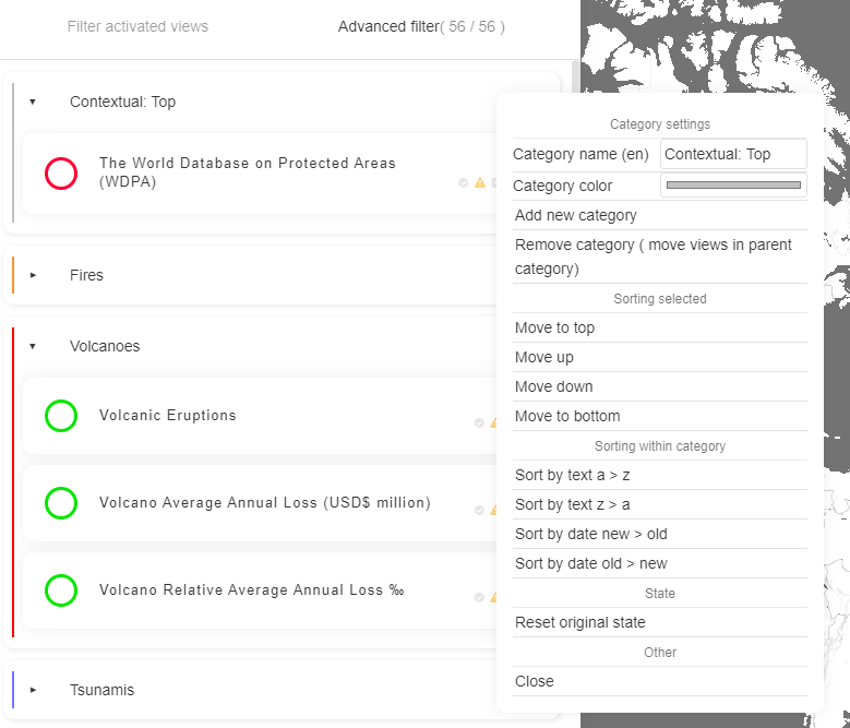 The order of the views in the views’ panel can be customized by each user with a simple dragging action operated on the title of the view or by using predefined alphabetic and date sorting methods. Furthermore, each user can customize the appearance of its panel by grouping views into user-made “categories” that can be seen as containers for views that cover the same topic (i.e., “contextual layers” vs “biodiversity”) or share any similarity.