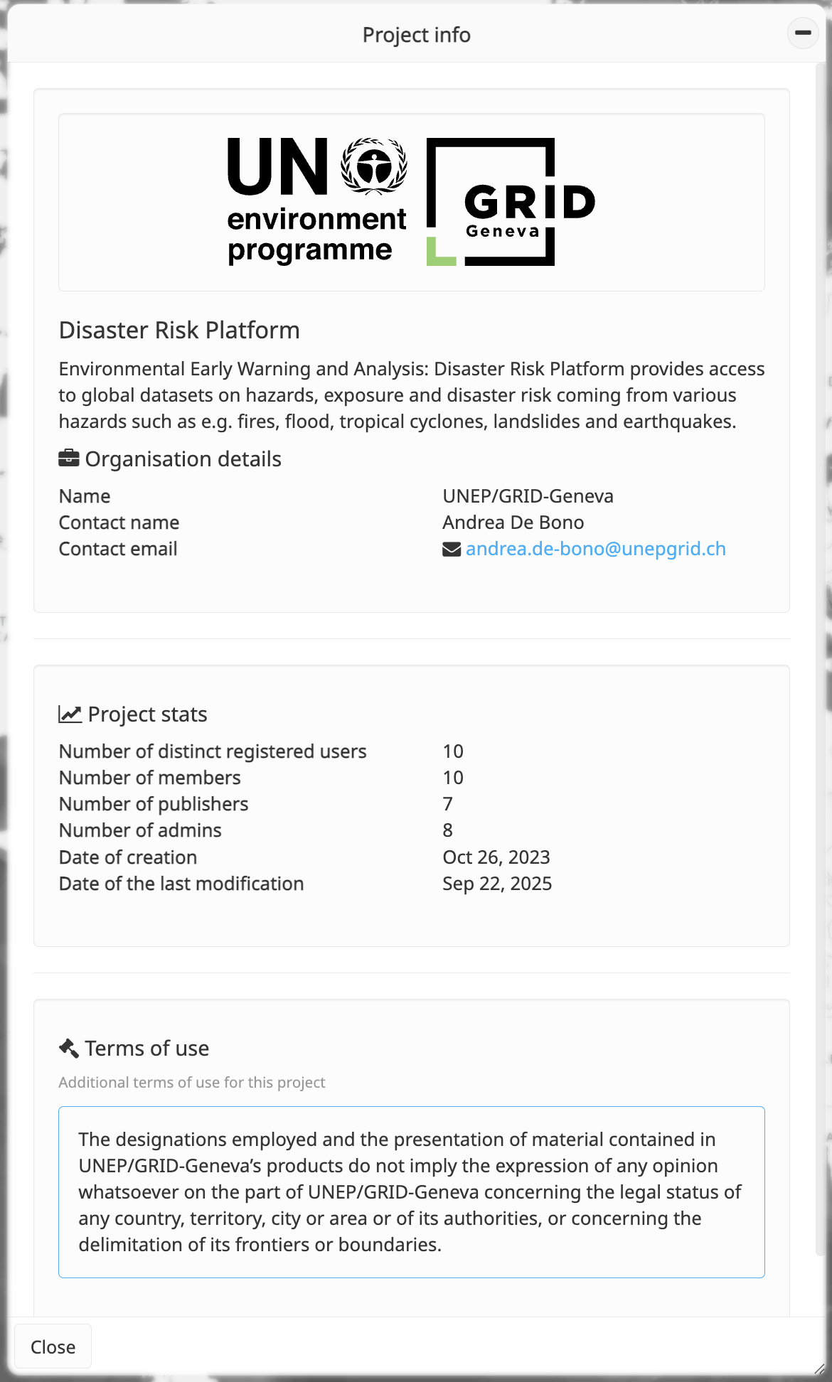 Next to the project title, users will find an information (i) button. Clicking this button provides access to essential details about the project. This includes information about the project’s organisation, relevant statistics, and project-specific Terms of use. These terms are designed to complement the general MapX terms, ensuring that users have a complete understanding of the rules and guidelines that apply to the current project.