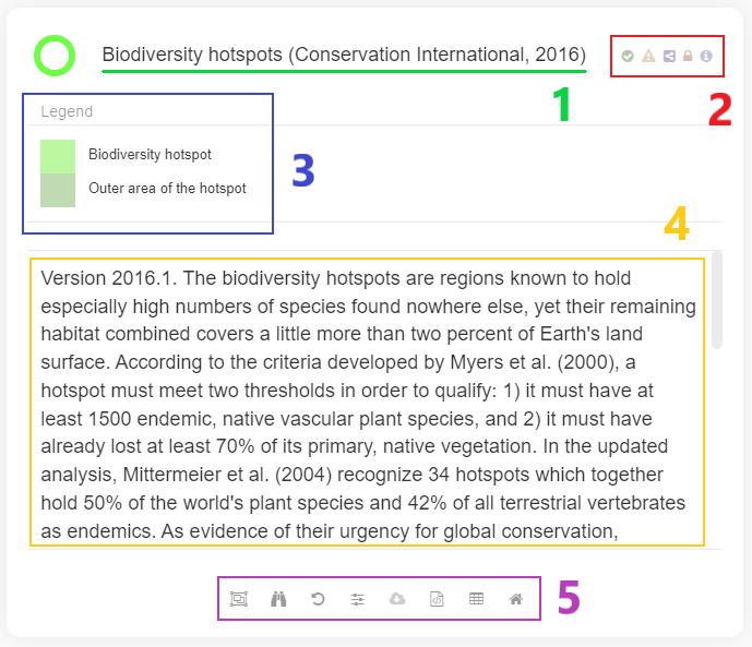 The different view types are identifiable in MapX by the color of the circle displayed to the left of their title: - green: vector - purple: raster - blue: story map - red: custom code - orange: local GeoJSON